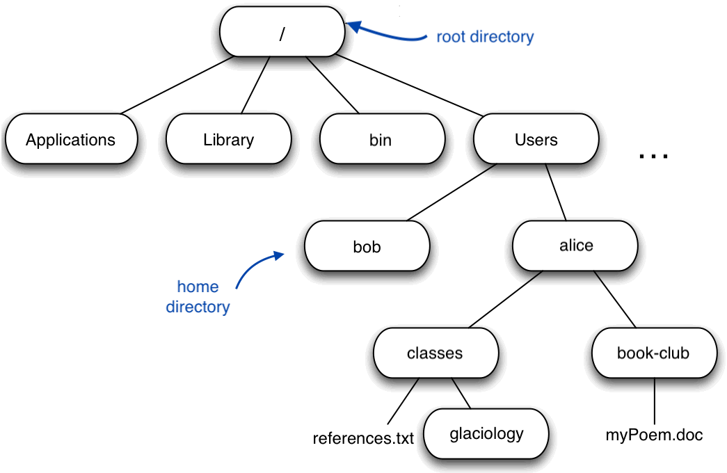 As you may now see, using a bash shell is strongly dependent on the idea that your files are organized in a hierarchical file system. Organizing things hierarchically in this way helps us keep track of our work: it’s possible to put hundreds of files in our home directory, just as it’s possible to pile hundreds of printed papers on our desk, but it’s a self-defeating strategy.